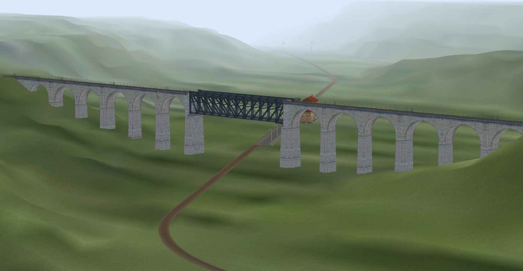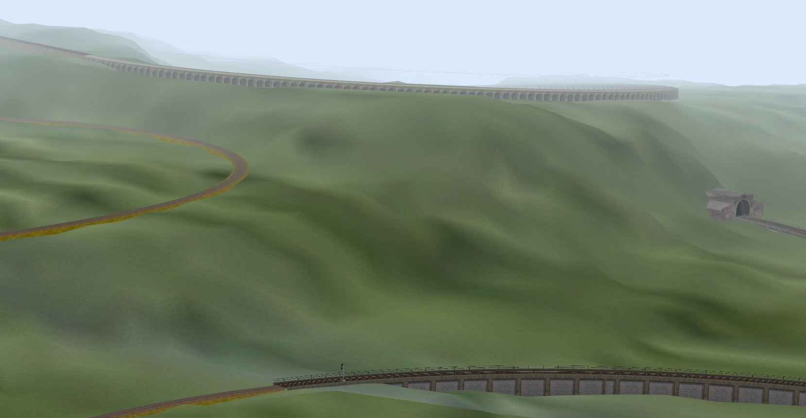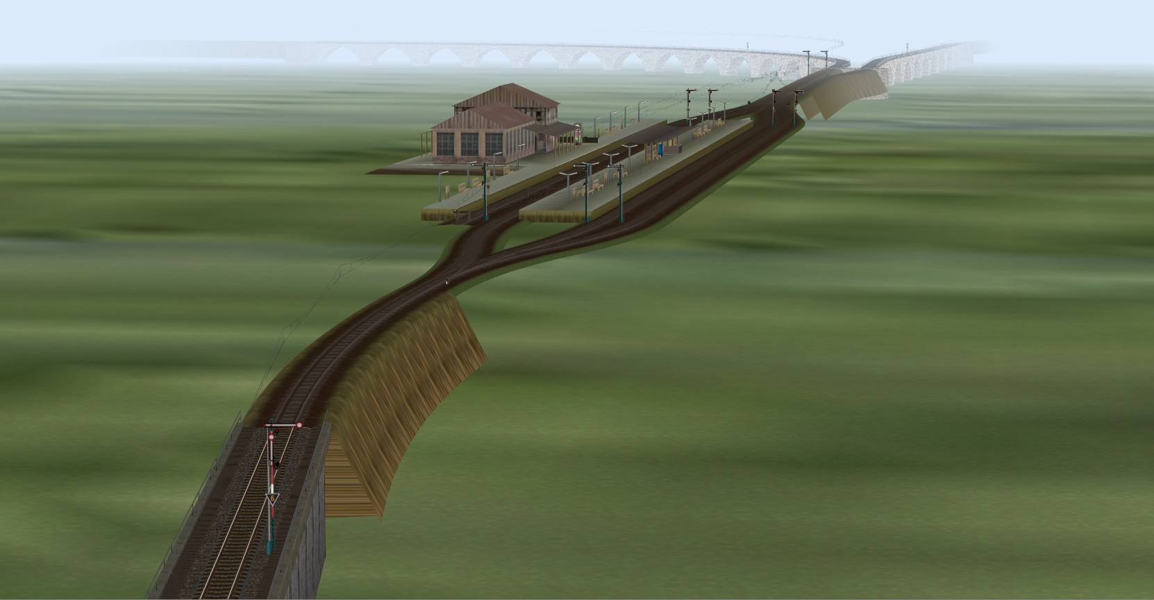 Auf dieser, auch wieder, reinen Phantasieanlage befinden sich zwei Kleinstädte, die durch eine 3gleisige Hauptverkehrsstrecke miteinander verbunden sind.